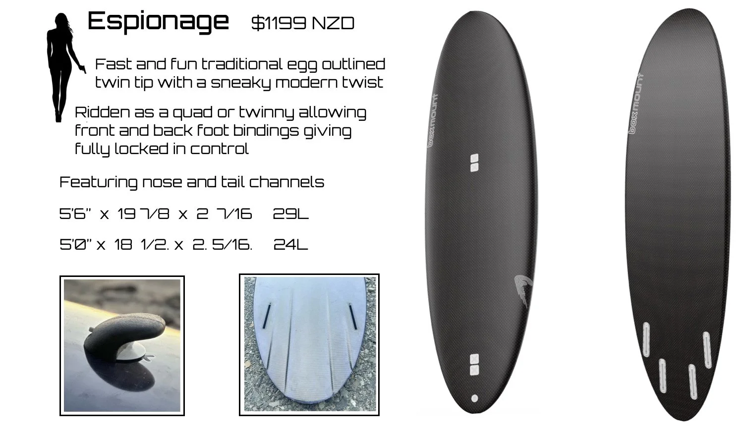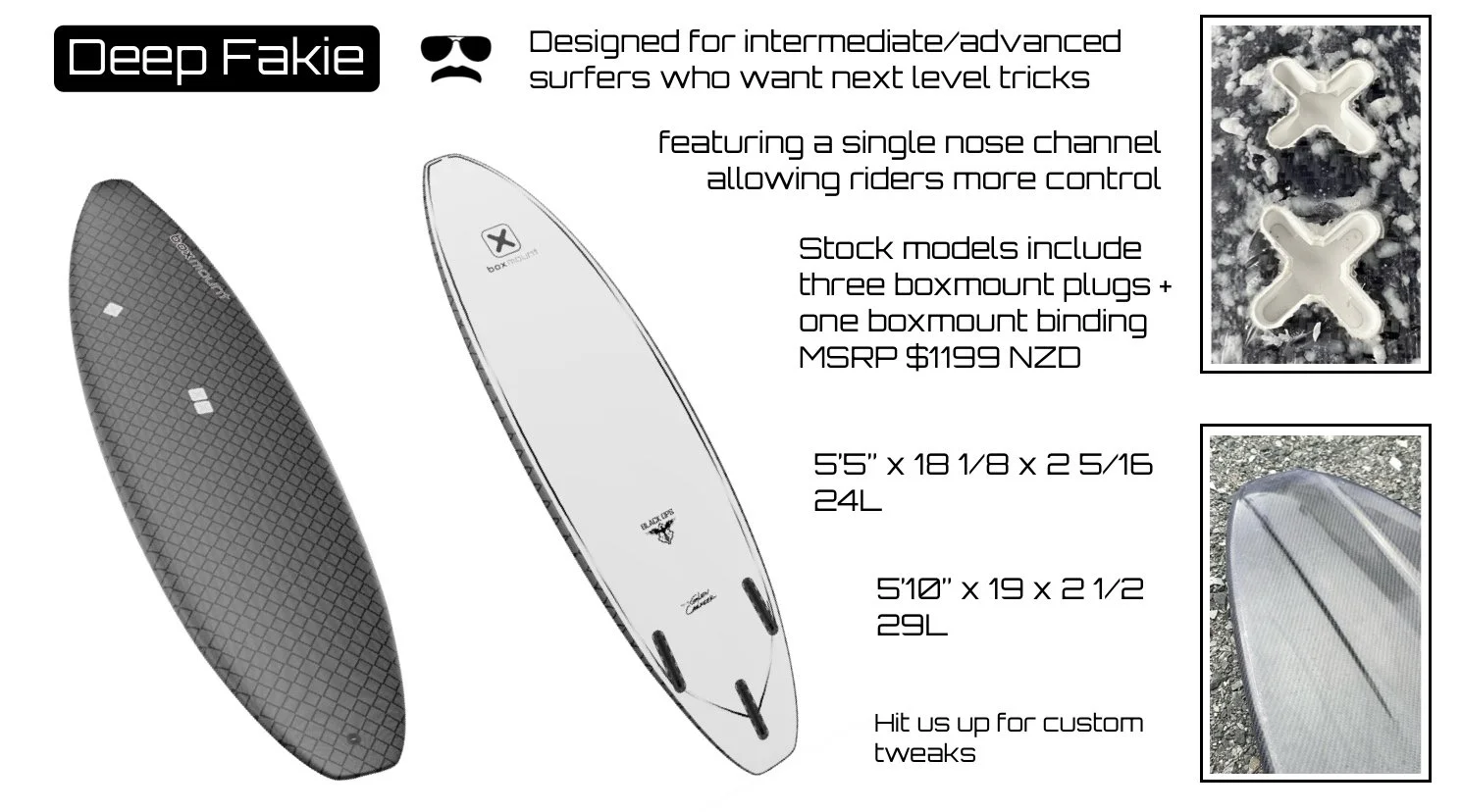 boxmount has teamed up with primal surf to create high performance, state of the art surfboards for the ocean or wavepool. Designed for intermediate/advanced surfers who want next level tricks. Featuring nose channels to allow riders more control when riding backwards. Stock models include Boxmount Plugs and Boxmount Bindings MSRP $1199 NZD